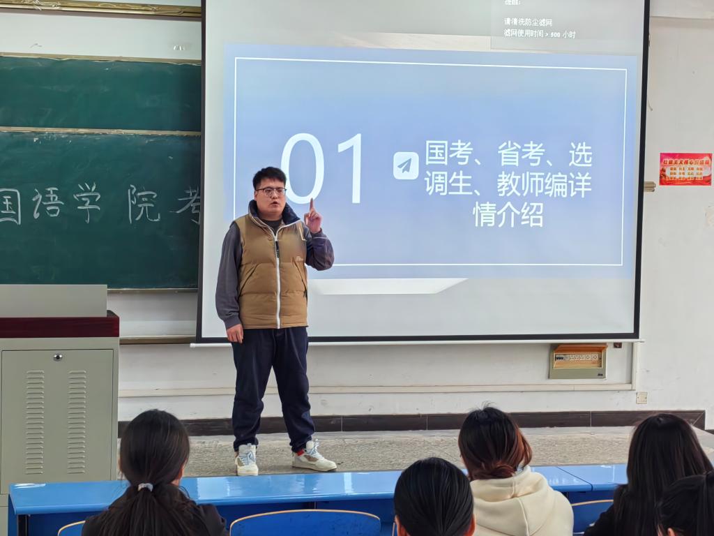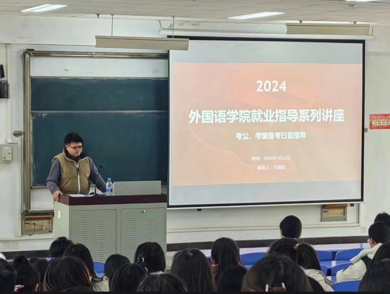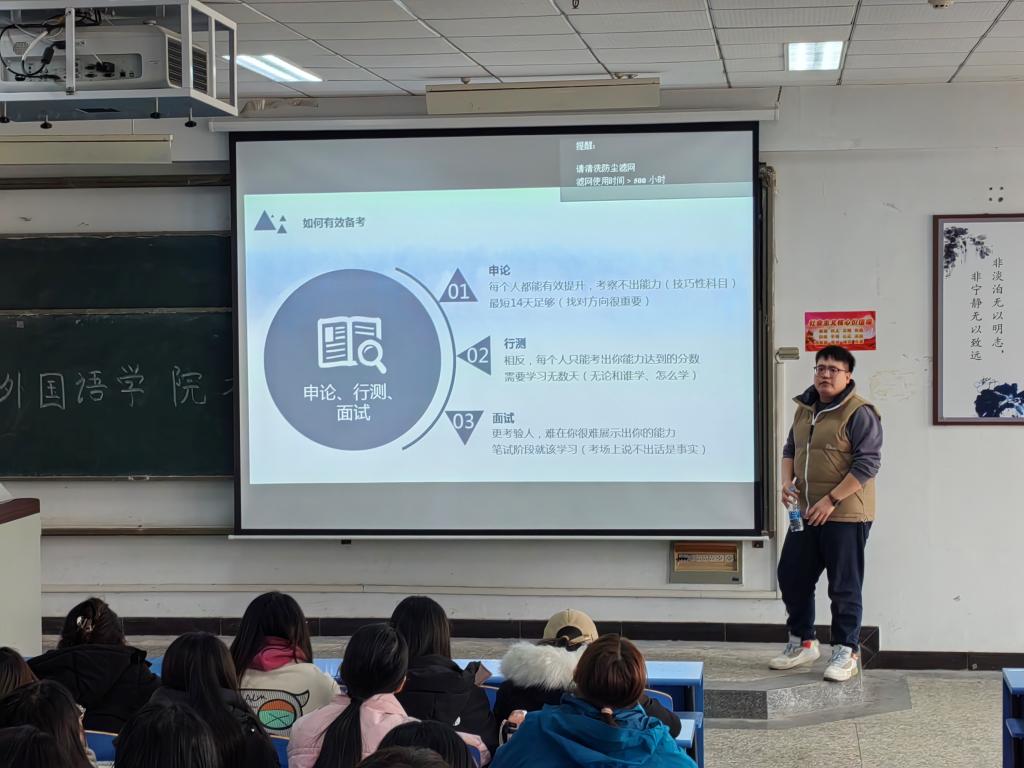 为切实提高外院学生考公率、考编率,转变学生就业意识,树立正确的就业观,更好地帮助毕业生就业、择业,pg娱乐电子游戏官网入口开展“我的未来在就业”系列就业指导讲座活动,2月27日下午在北院文九阶梯举行了《公务员、事业编考试基础知识扫盲》讲座,开启了此项系列讲座活动。主讲人为深耕考编考公4年的王明旭老师,2020级、2021级、2022级共180余名学生参加了本次讲座。