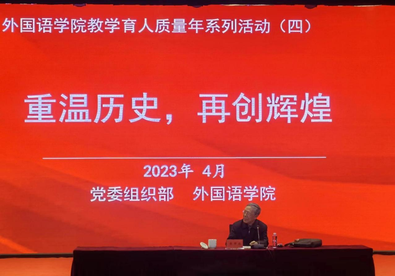 为重温pg娱乐电子游戏官网入口的光荣传统,砥砺师生传承精神担当使命,pg娱乐电子游戏官网入口同党委组织部于2023年4月4日下午,联合举办了pg娱乐电子游戏官网入口教学育人质量年活动之四——原外语系老主任张学忠教授应邀来pg娱乐官网在北院文体馆小剧场为全体师生作了题为《我所热爱的外语教育事业》的报告,本次活动由pg娱乐电子游戏官网入口院长唐翠云主持。