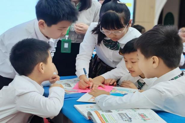 在课堂观摩环节,刘效菊老师以冀教版五年级下册《Lesson 7 Arrive in Beijing》为内容授课,借助情景剧表演、学生卡片结组展示等互动形式,引导学生用英语讲述“北京之旅”。孩子们在角色扮演中熟练运用方位介词,课堂气氛十分热烈。刘常艳老师的大猫英语分级阅读课《Weather Report》,通过播放视频、组内讨论等方式,让每个孩子都有展示机会。听课教师认真记录“任务驱动+技术辅助”的创新设计,积极交流并给出宝贵建议,师生表现出色。