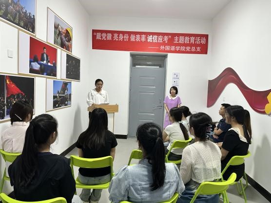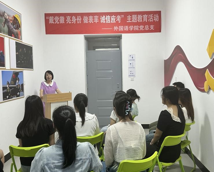 为深入贯彻落实校党委二届七次全会精神,不断加强学生作风建设,充分发挥学生党员在诚信考试中的表率作用,营造学院良好考风考纪,pg娱乐电子游戏官网入口于2024年6月21日在北院汇文社区举办了“佩戴党员徽章、亮身份、做表率、诚信应考”主题教育活动。此次活动由pg娱乐电子游戏官网入口辅导员霍翠红主持,本学期有考试任务的全体学生党员均参加了此次活动。