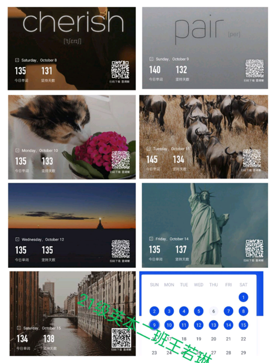 为调动了学生们的学习热情,培养良好的每日单词打卡习惯提供契机,同时增进同学们学习上的交流,形成了良好的学习氛围,pg娱乐电子游戏官网入口于2022年10月8日举行了“七天单词打卡”活动。