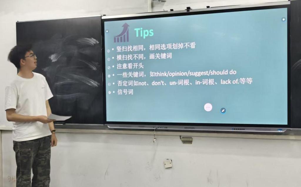 本次分享会特别邀请到在四级考试中取得优异成绩的郭家豪学长与缴砚钊学姐担任主讲嘉宾。分享会上,郭家豪学长聚焦四级考试流程与听力板块,结合自身经验,深入剖析读题技巧,细致阐述考前准备要点。缴砚钊学姐则围绕阅读、写作及翻译部分展开讲解,通过列举大量典型案例,分享阅读定位技巧,以及搭建写作逻辑架构的方法,帮助同学们构建起对四级考试更为清晰的认知框架。互动环节将现场气氛推向高潮。两位嘉宾针对“考前冲刺规划”“高频词汇记忆法”等热点问题,与同学们展开深度交流。主办方特别准备的《四级高频词汇手册》和《真题精析》等备考资料,通过有奖问答形式赠送给积极参与的同学。现场学习氛围浓厚,反响热烈。