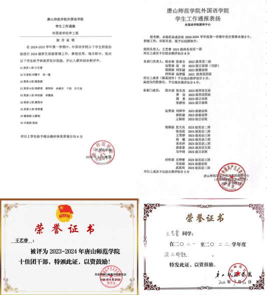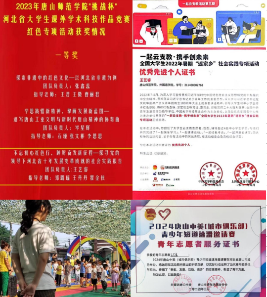 王艺睿深知,知识的价值在于实践。2021年暑假,她组建团队赴河北承德、定州开展“三下乡”社会实践,将英语教学与红色文化宣讲相结合,活动获评“全国优秀大学生志愿者”称号。此后,她连续两年深入幼儿园开展志愿服务,用耐心与爱心赢得家长赞誉。2023年,她带领团队参加“挑战杯”红色专项活动,走访河北省红色地标,以扎实的调研成果斩获省级一等奖。2024年,她作为翻译志愿者领队参与中国青少年短道速滑邀请赛,在跨文化沟通中展现专业素养,获评“国安宣传大使”。这些经历不仅锤炼了她的能力,更让她坚定了“将青春写在祖国大地上”的信念。
