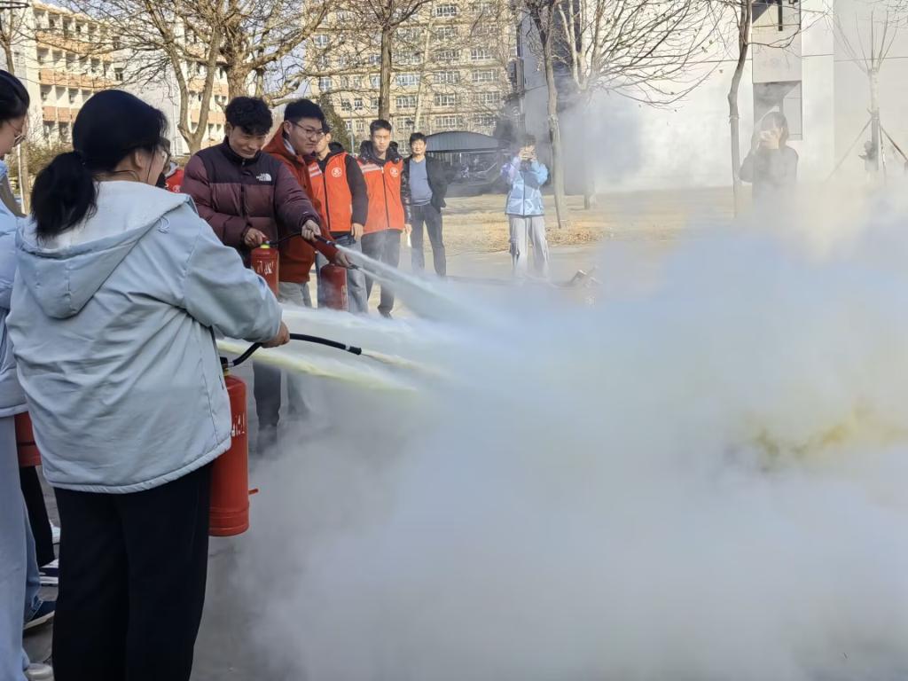 演练结束后,学生干部宣传灭火器操作 “提(提灭火器)、拔(拔保险销)、握(握喷管)、压(压手柄)” 四步要诀,讲述消防喷管需与火焰根部呈 45 度角;疏散时要低姿前行、用湿毛巾捂口鼻,增强大家的消防安全意识。