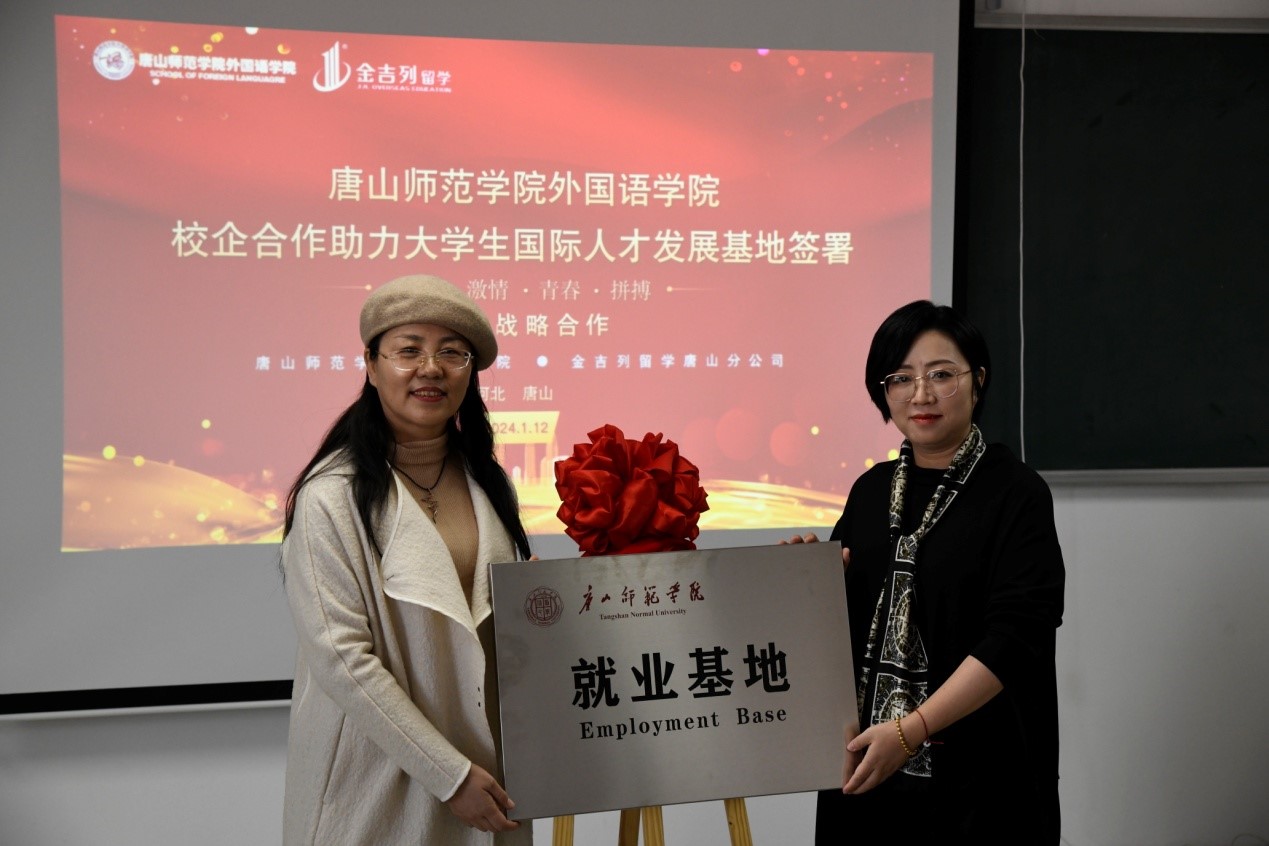 随后,在与会人员的见证下,pg娱乐电子游戏官网入口与唐山金吉列留学正式签署了“创新创业国际人才培养基地”、“实践教学基地”“就业基地”项目合作书,并完成了揭牌仪式。