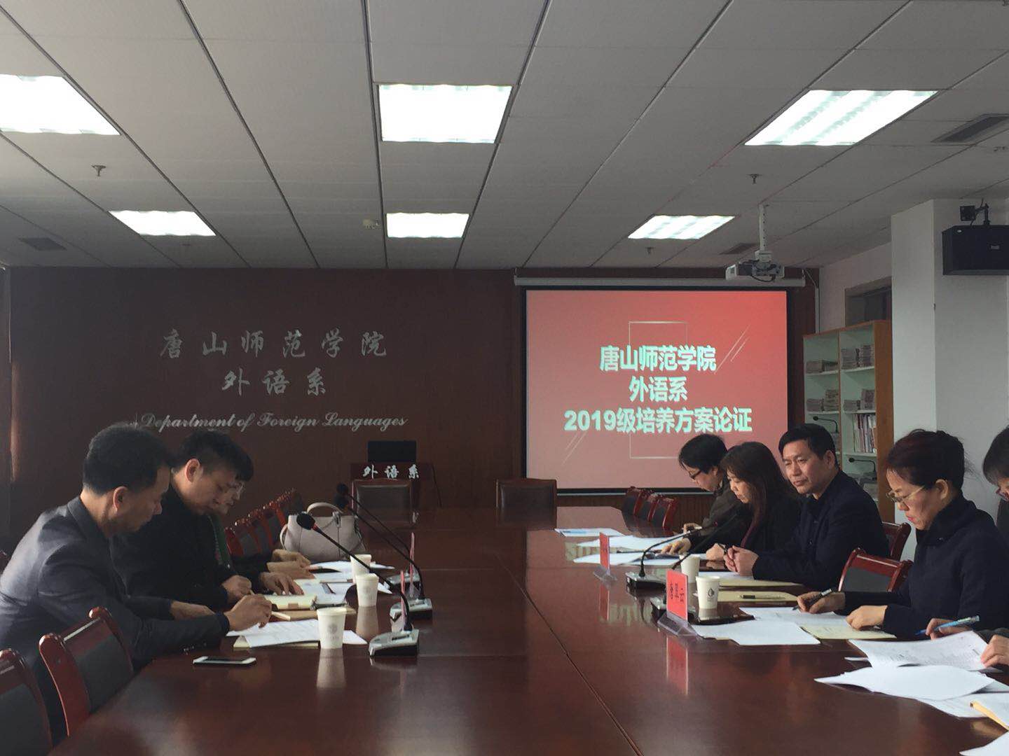 此次论证会邀请唐山市教育局教研室英语教研员田民、玉田县教研训中心初中部主任张丽丽、丰润区教育局初中教研室主任李国刚三位特聘专家参与此次论证。外语系邓晓峰主任、唐翠云副主任,师范英语各教研室主任、教务办公室成员参加此次会议。