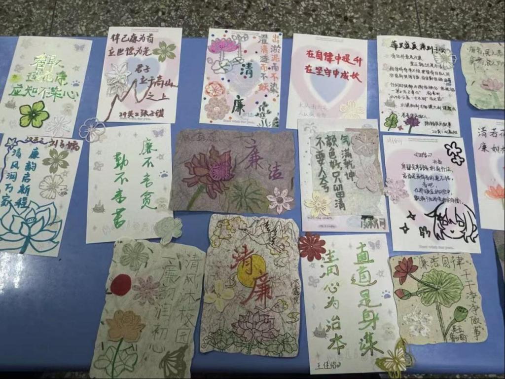 活动现场气氛热烈,同学们积极参与。大家围坐在一起,精心制作廉洁宣言卡。有人以苍劲有力的书法写下廉洁警句,有人用细腻的画笔勾勒出象征廉洁的莲花、翠竹等图案,还有人用真挚的文字表达自己对廉洁的独特理解与坚守。小小的卡片上,凝聚着参与者对廉洁的深刻感悟和郑重承诺。